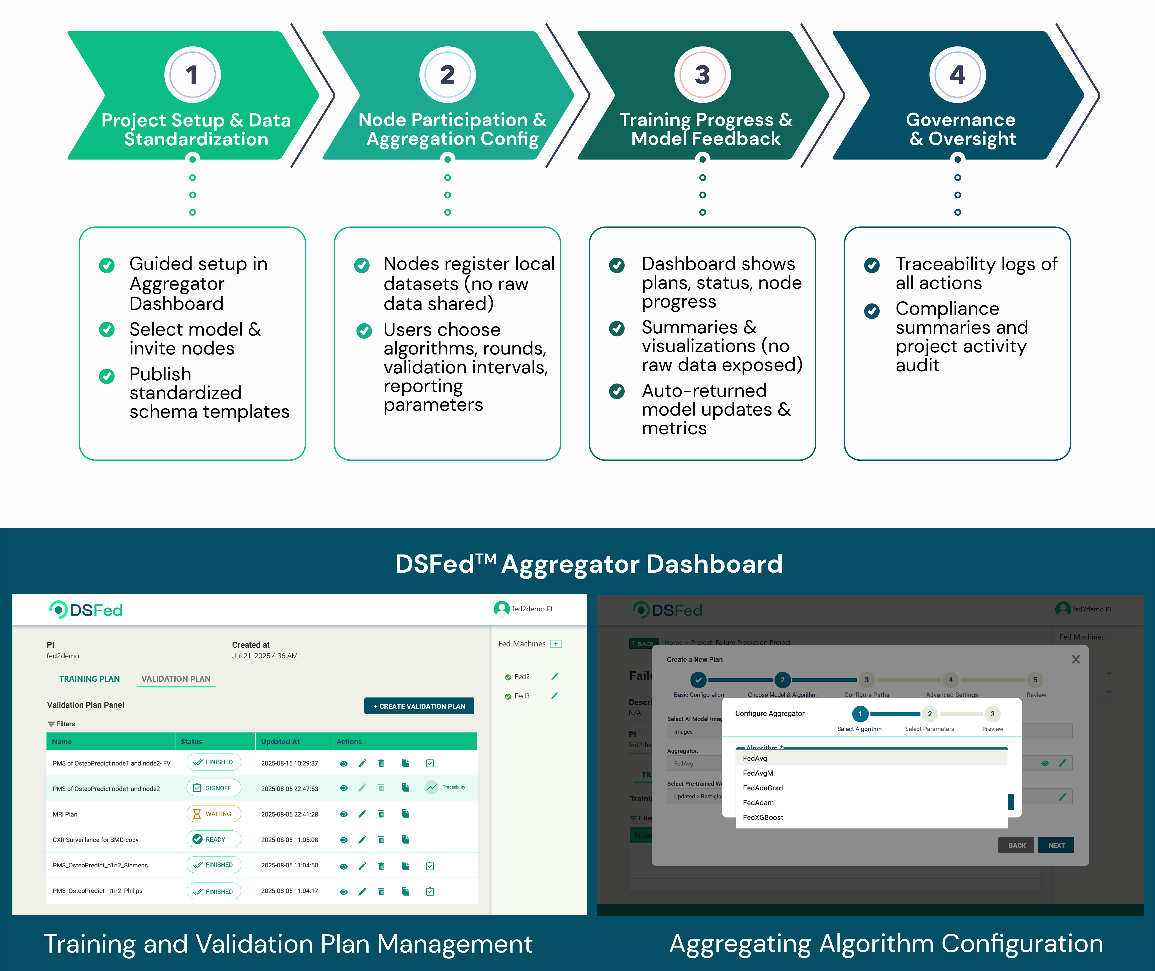 To make federated learning practical, accessible, and repeatable, DSFed™ turns a traditionally complex process into a four-step workflow that is easy to configure, manage, and monitor. Agencies can see exactly how projects progress through setup, participation, training, and governance. The accompanying interface screenshots show how DSFed brings these stages together in a clean, accessible user experience.