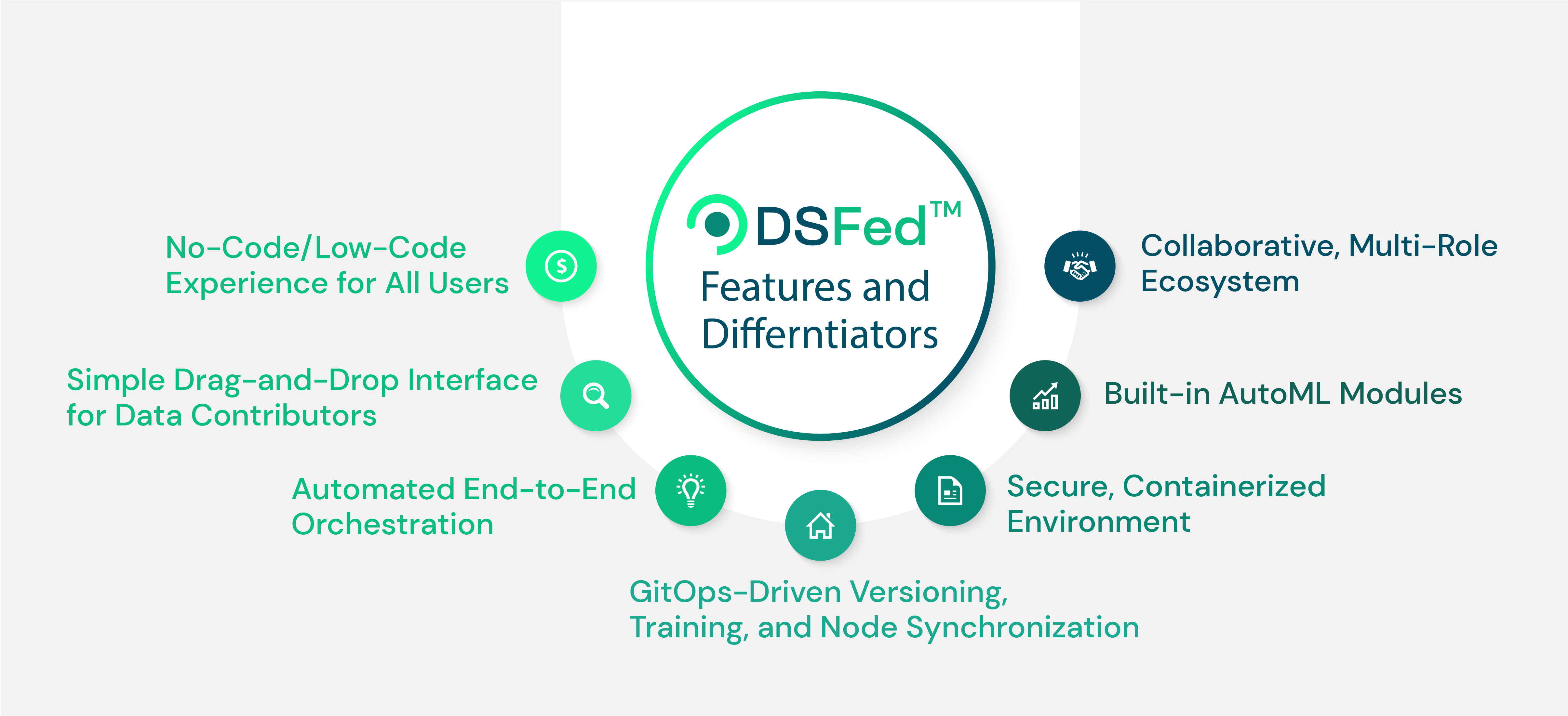 DSFed delivers advanced FL capabilities in a secure, containerized environment designed for both technical and non-technical users. With a simplified interface and automated orchestration, it removes the complexity from setup and operation. Its key differentiator is a production-ready architecture that unifies and automates the entire FL pipeline, from data governance through model deployment, via a low-code experience. Its GitOps-inspired architecture automates versioning, training coordination, and node synchronization, allowing users to focus on results rather than process or infrastructure.